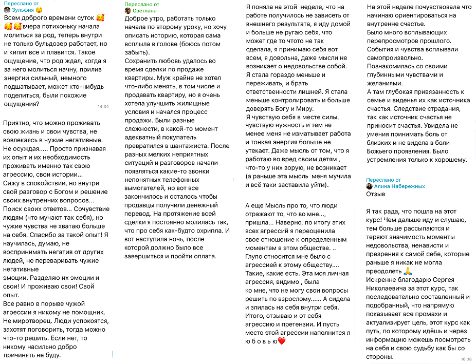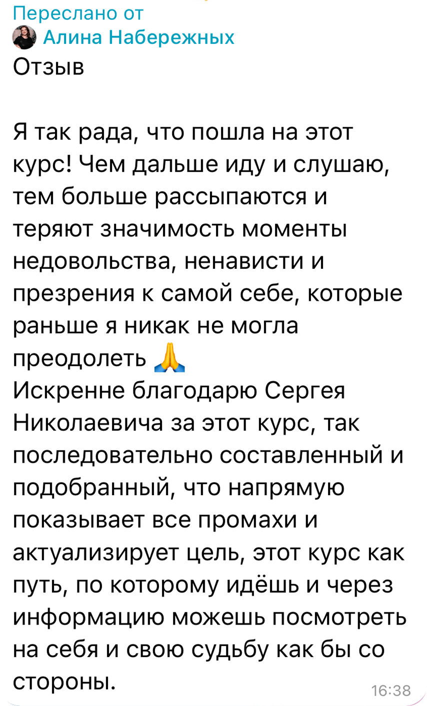 — Я видела много разных истории. Есть участники, которые пришли на курсы впервые, но их душа словно много лет готовилась именно к этому курсу, ждала возможности глубинных изменений и получила мощный импульс к ним на курсе. И у них, бывает, неожиданно быстро происходят значимые трансформации. Правда, Сергей Николаевич часто напоминает новичкам, что это только «аванс», а не «зарплата», поэтому впереди ещё много работы над собой. Таким людям каждое взаимодействие с куратором даёт что-то ценное. Главное, чтобы они были готовы слышать.