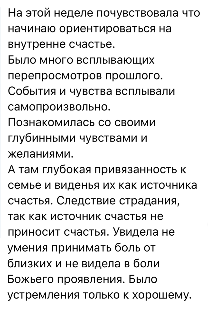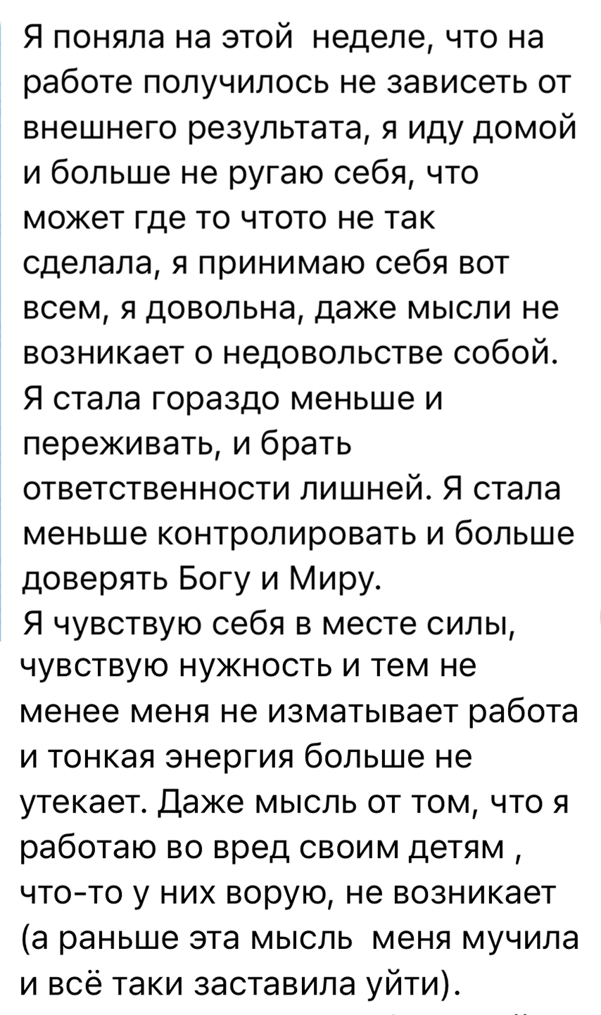 — Опытные «лазаревцы» знают, что работа над собой не закончится никогда. И их это не пугает, а, наверное, даже успокаивает. Можно многое знать, но не уметь, понимать, но не чувствовать... Поэтому для тех, кто давно в системе, результаты происходят на более глубинных уровнях — не только у них, но и у детей, супругов, и даже у родителей.
