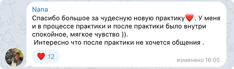 Вы проследуете за голосом автора под медитативный видеоряд и музыку, отрешаясь и погружаясь в глубинные чувства. Дополнительные паузы в практике дадут возможность проработать важные моменты в жизни.